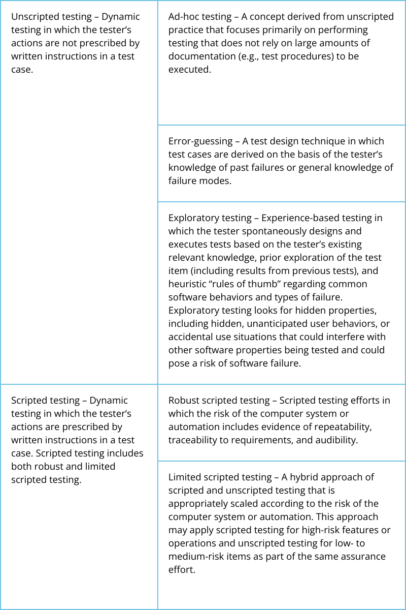 Table 1 – Unscripted and Scripted testing is further detailed in the table below.