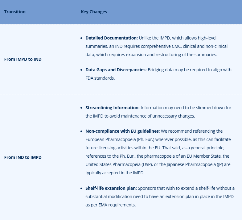Table 2 - Key regulatory differences when transitioning between IMPD and IND submissions