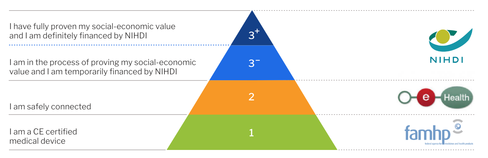A diferencia de Alemania, que cuenta con una normativa específica sobre DTx, Bélgica no ha manifestado su intención de regular directamente las aplicaciones sanitarias digitales. En su lugar, el país da prioridad a la prescripcióny el reembolso. Bélgica cuenta con un "proceso piramidal" escalonado para navegar por este flujo de aprobación.